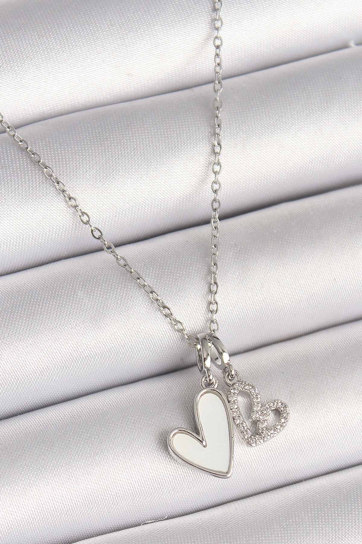 316L Çelik Gümüş Renk Zincir 2'Li Sallantı Zirkon Taşlı Kalp Model Kadın Kolye - TJ-BKO9858