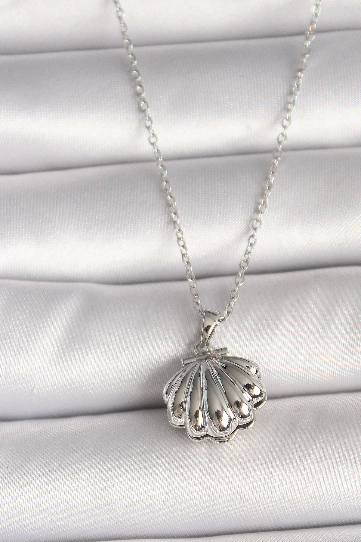 316L Çelik Gümüş Renk Zincir Açılır İncili Midye Model Kadın Kolye - TJ-BKO9995