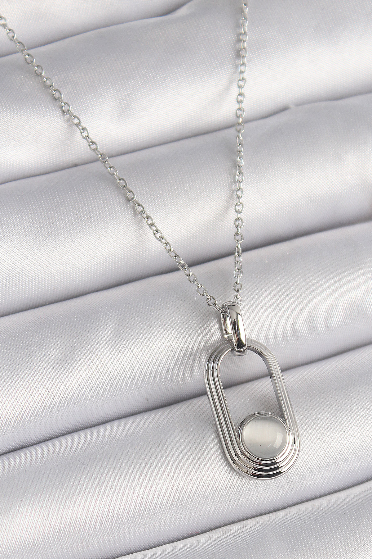 316L Çelik Gümüş Renk Zincir Beyaz Kedi Göz Model Kadın Kolye - TJ-BKO9612