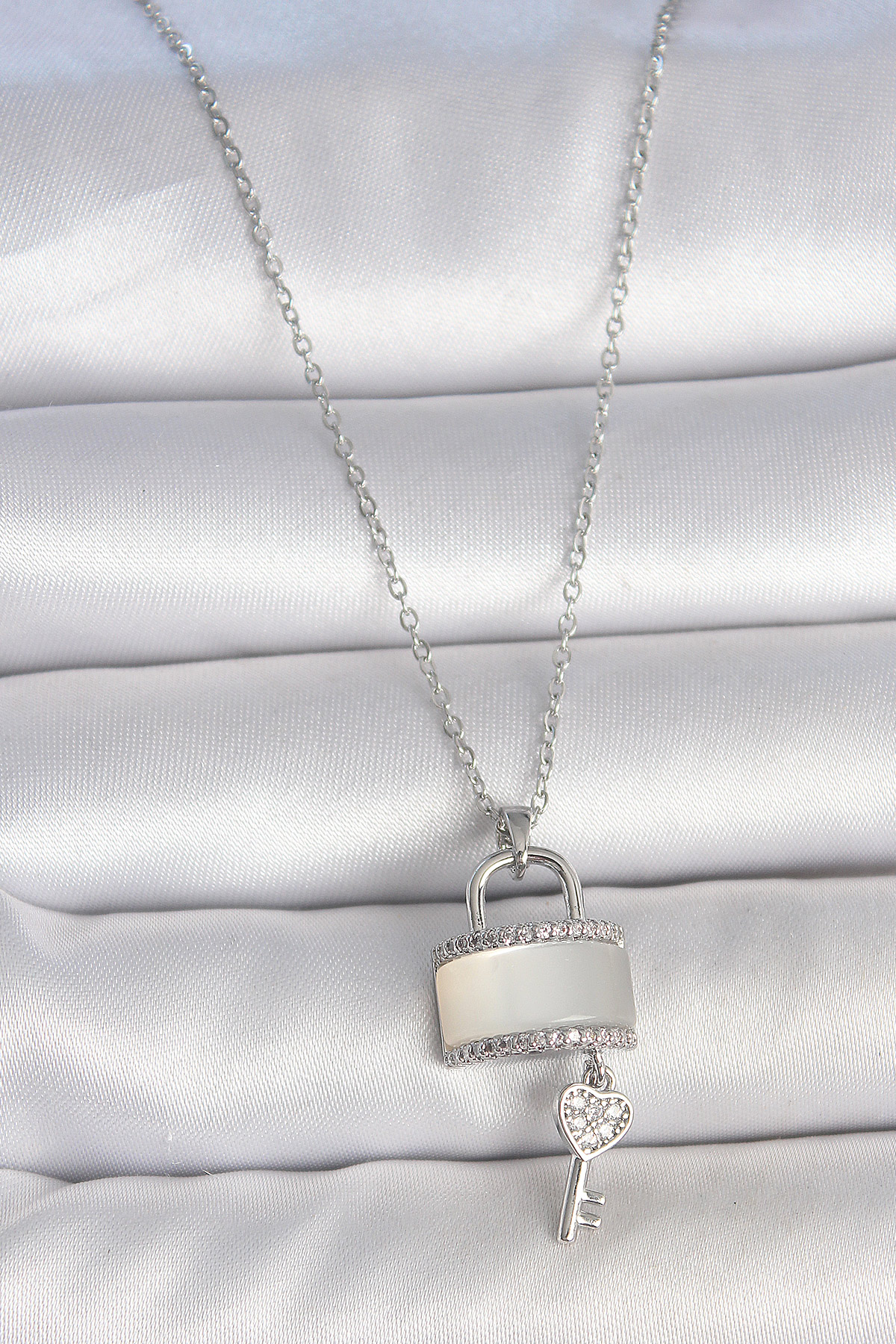 316L Çelik Gümüş Renk Zincir Beyaz Sedefli Kilit Anahtar Detay Kadın Kolye - TJ-BKO10108