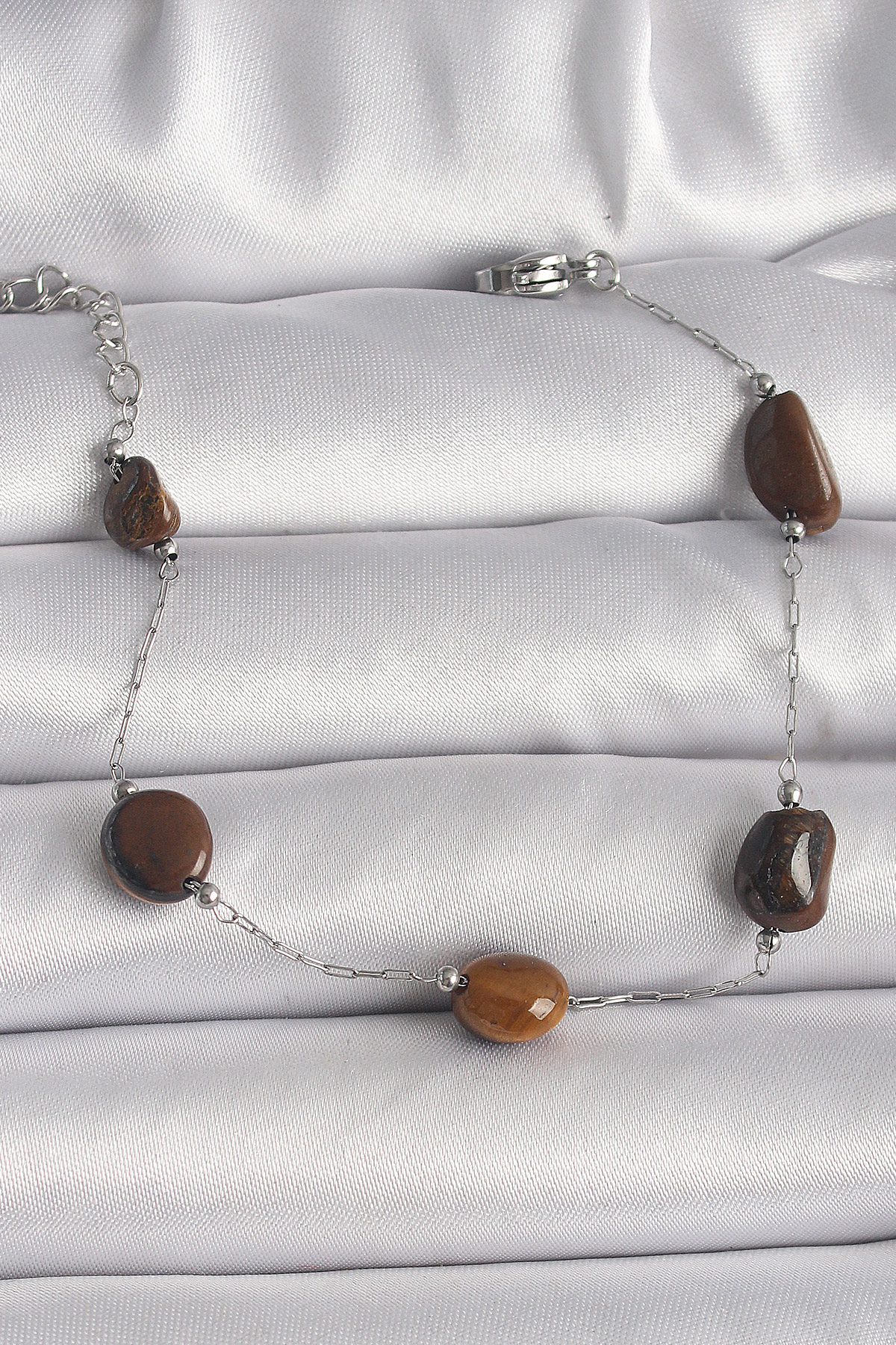 316L Çelik Gümüş Renk Zincir Kahverengi Doğaltaş Model Kadın Bileklik - TJ-BB6596