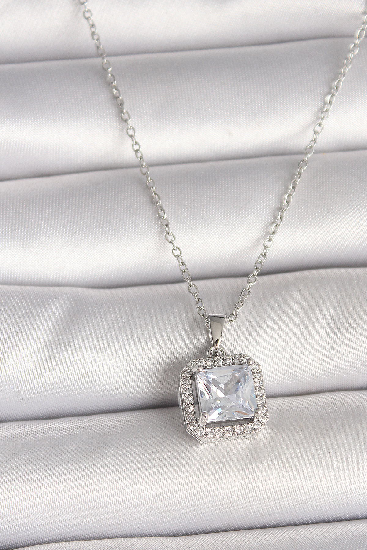 316L Çelik Gümüş Renk Zincir Kare Zirkon Taşlı Kadın Kolye - TJ-BKO9993