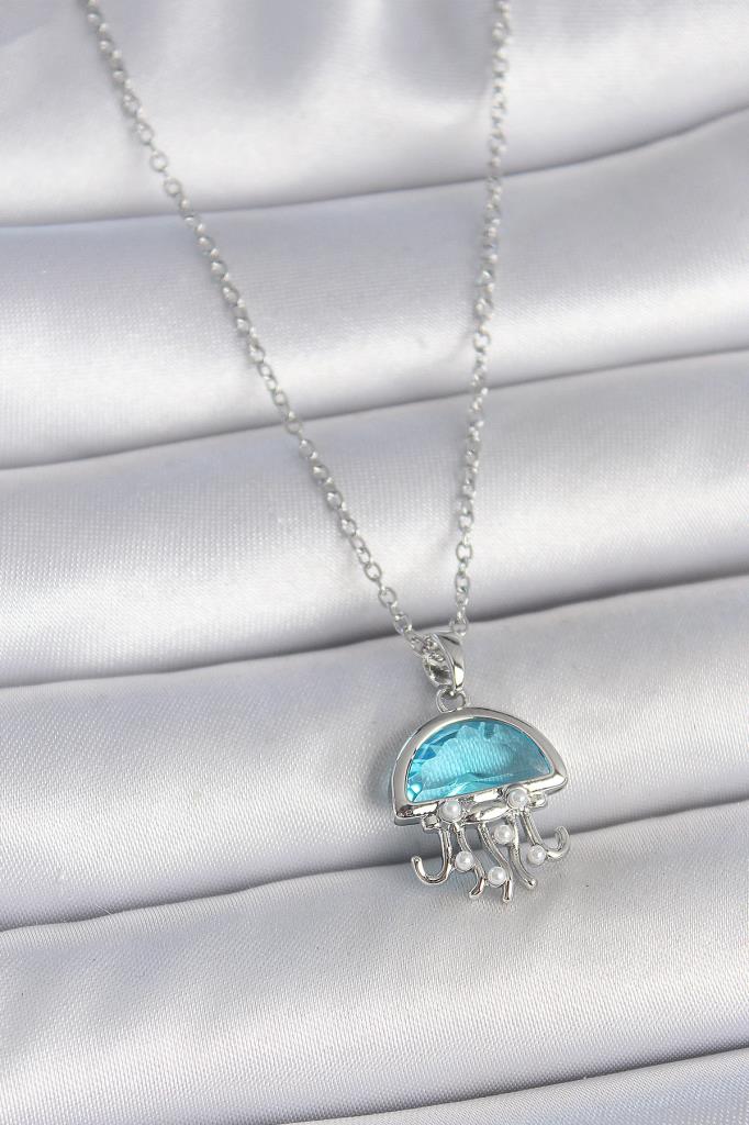 316L Çelik Gümüş Renk Zincir Mavi Taşlı Deniz Anası Model İnci Detay Kadın Kolye - BKO10042
