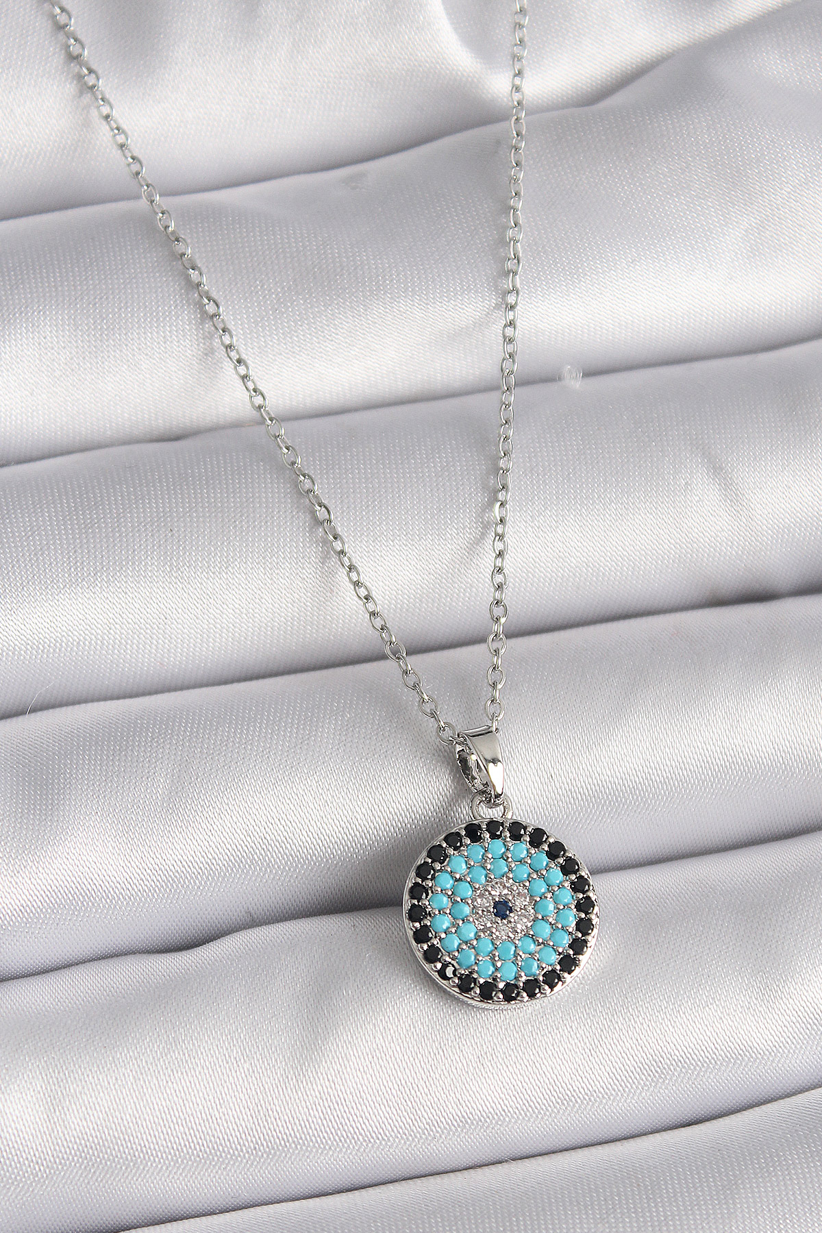 316L Çelik Gümüş Renk Zincir Nazar Boncuk Madalyon Model Kadın Kolye - TJ-BKO9485