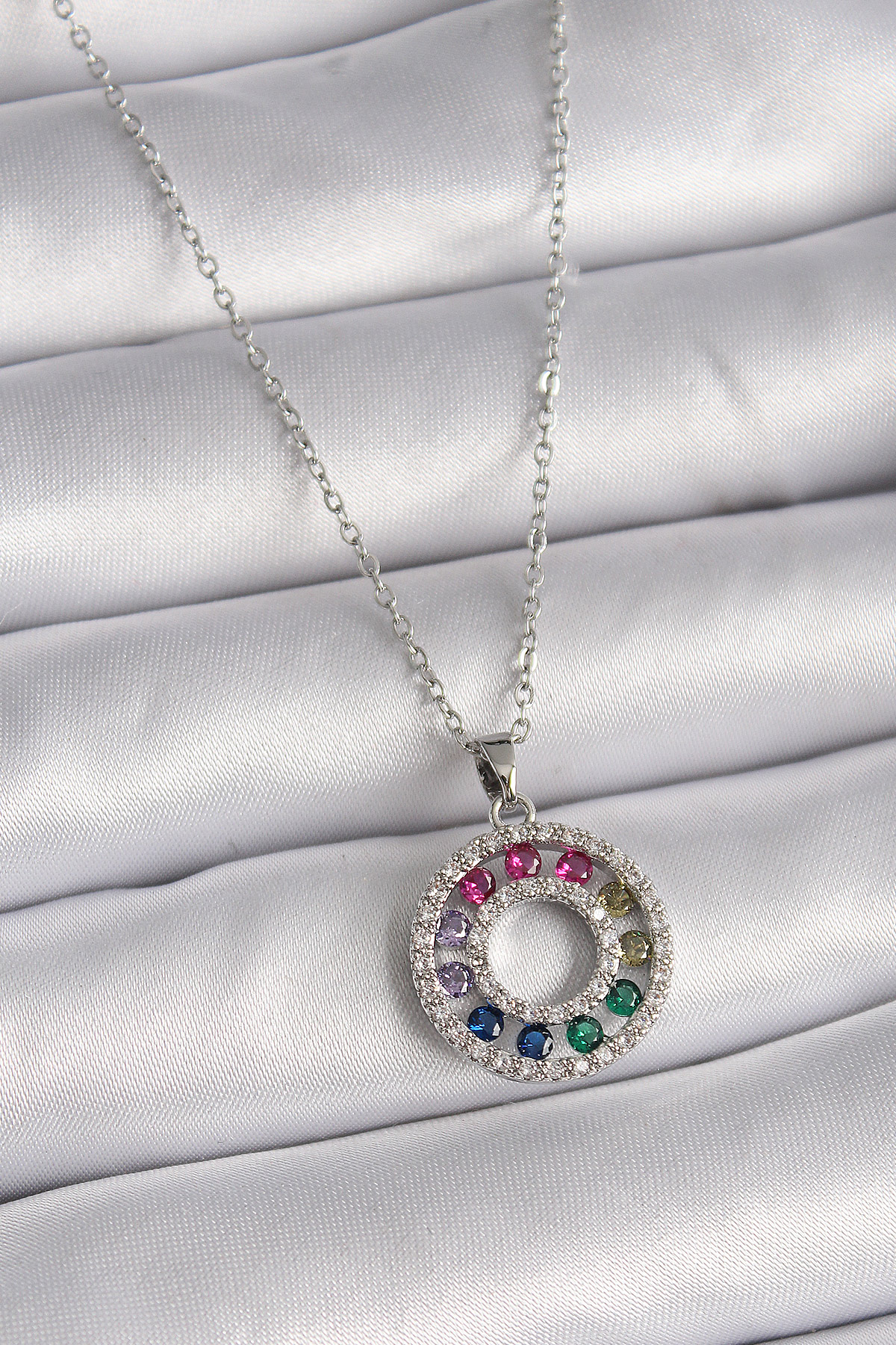 316L Çelik Gümüş Renk Zincir Renkli Zirkon Taşlı Madalyon Model Kadın Kolye - TJ-BKO9489
