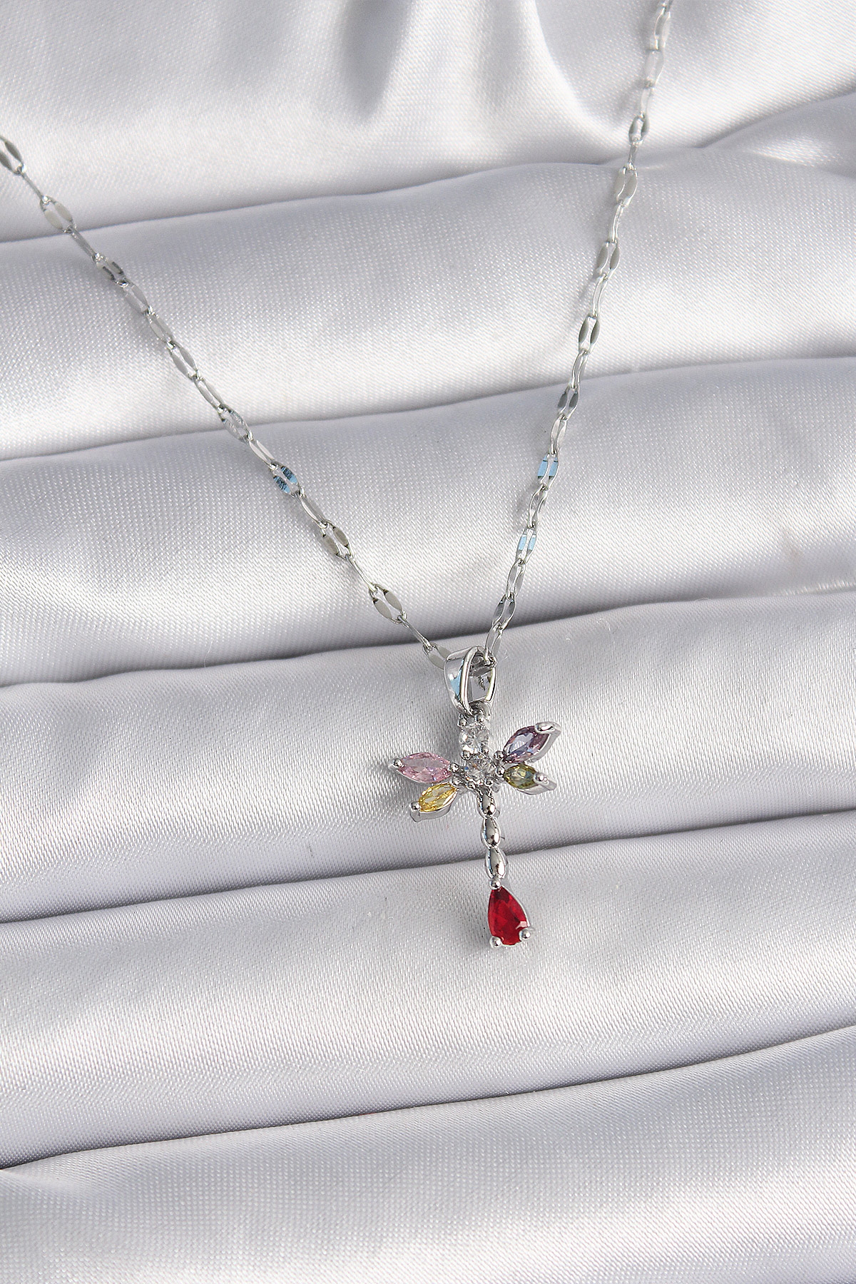 316L Çelik Gümüş Renk Zincir Renkli Zirkon Taşlı Yusufçuk Model Kadın Kolye - TJ-BKO9568