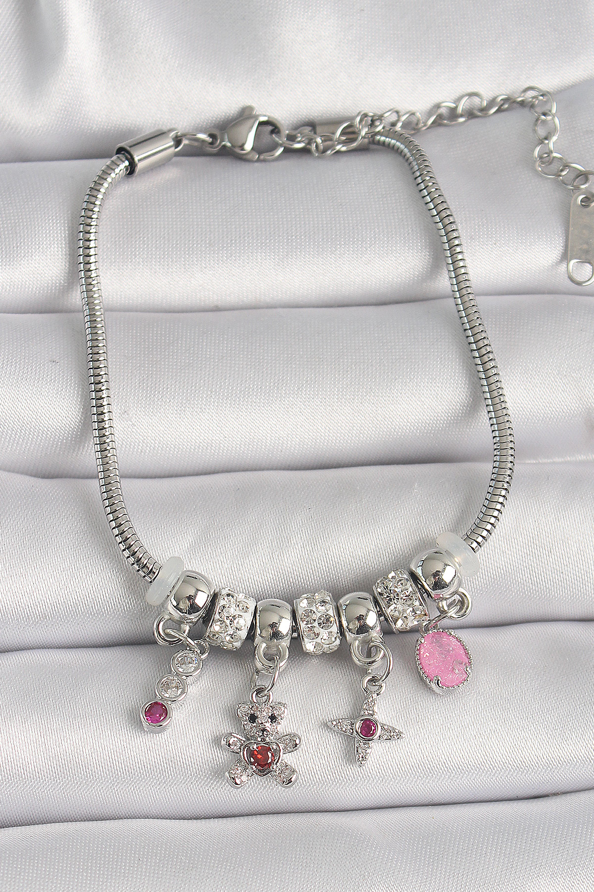 316L Çelik Gümüş Renk Zincir Sallantı Zirkon Taşlı Ayıcık Figür Yıldız Detay Kadın Bileklik - TJ-BB6705