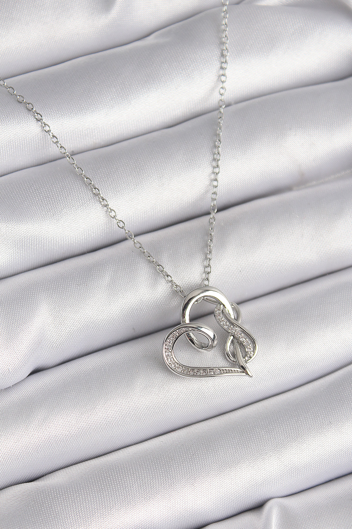 316L Çelik Gümüş Renk Zincir Zirkon Taş Detaylı Kalp Model Sonsuzluk Detay Kadın Kolye - TJ-BKO9584