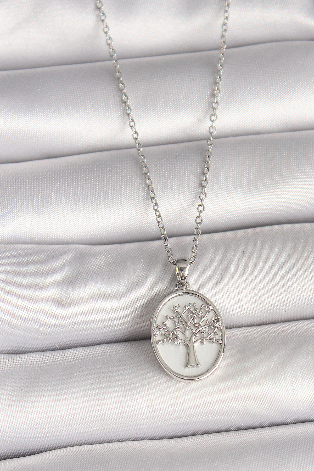 316L Çelik Gümüş Renk Zincir Zirkon Taş İşlemeli Beyaz Mineli Ağaç İşlemeli Portre Model Kadın Kolye - TJ-BKO9983