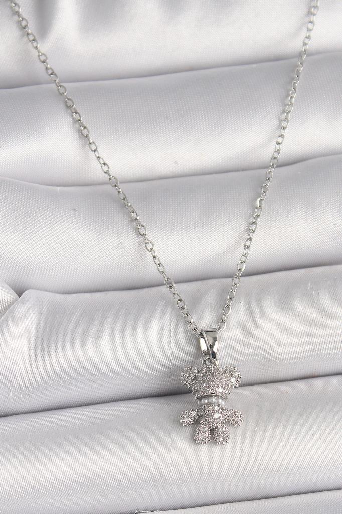 316L Çelik Gümüş Renk Zincir Zirkon Taşlı Ayıcık Figür Kadın Kolye - TJ-BKO9811