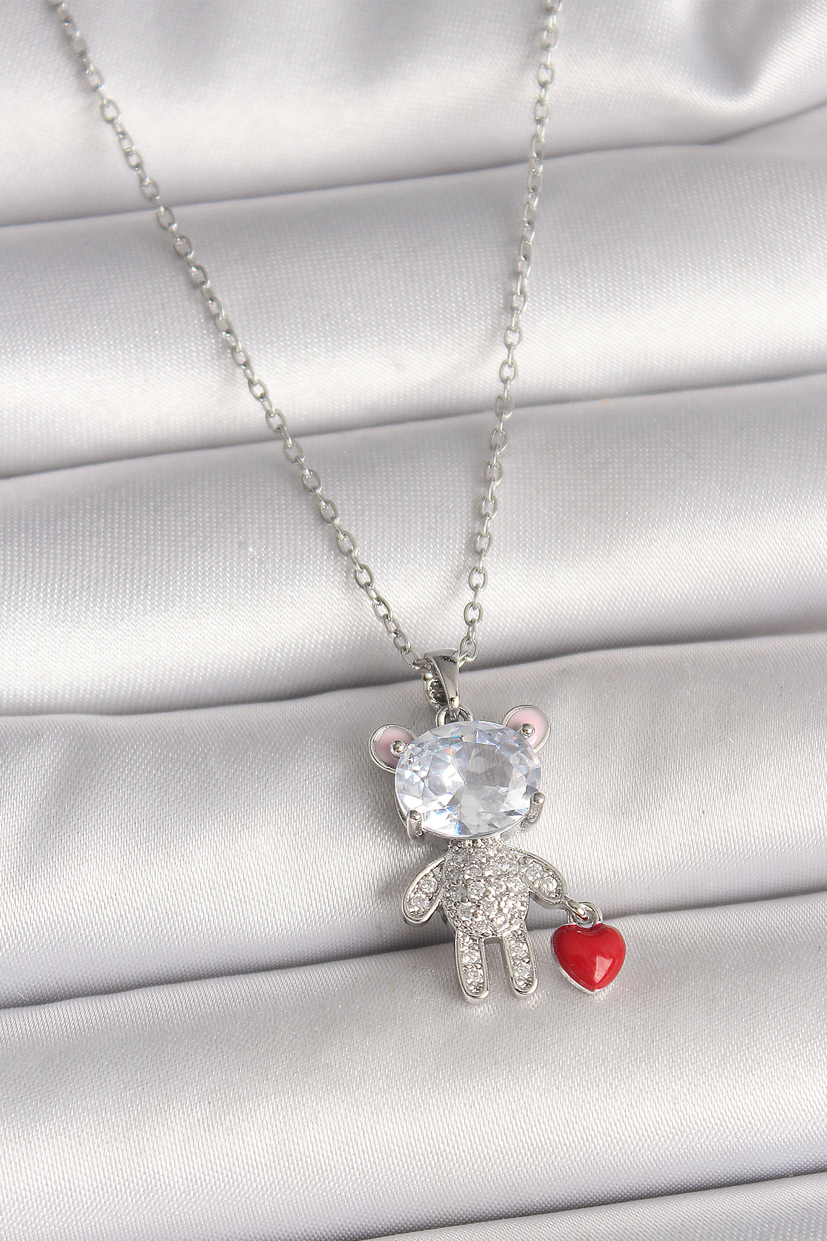 316L Çelik Gümüş Renk Zincir Zirkon Taşlı Ayıcık Model Kırmızı Kalp Detay Kadın Kolye - TJ-BKO9987