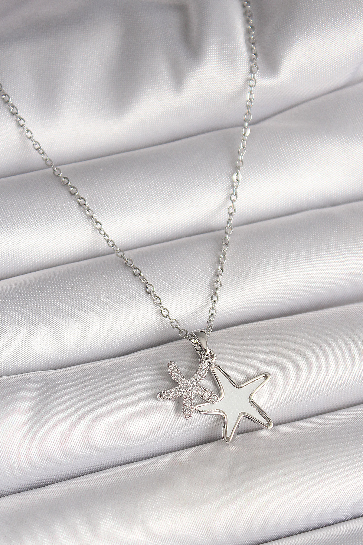 316L Çelik Gümüş Renk Zincir Zirkon Taşlı Beyaz Mineli Deniz Yıldız Model Kadın Kolye - TJ-BKO9945