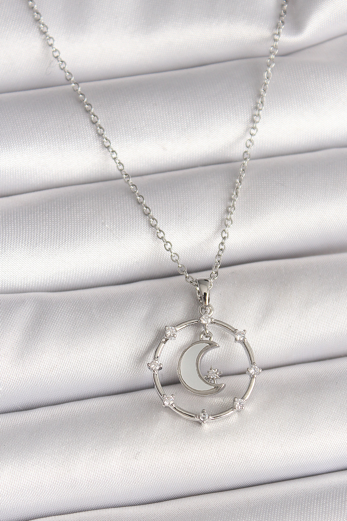 316L Çelik Gümüş Renk Zincir Zirkon Taşlı Beyaz Mineli Hilal Model Kadın Kolye - TJ-BKO9972