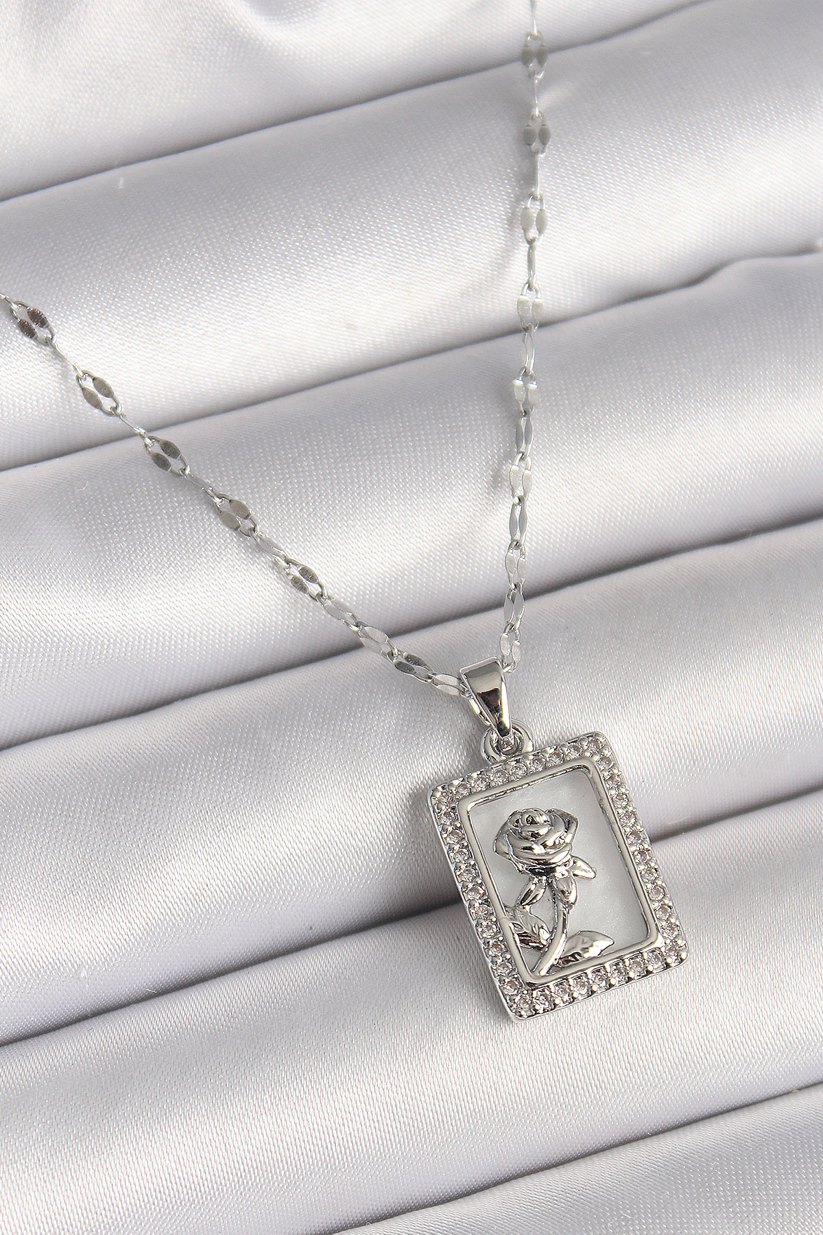 316L Çelik Gümüş Renk Zincir Zirkon Taşlı Beyaz Sedefli Gül Portre Model Kadın Kolye - TJ-BKO9892