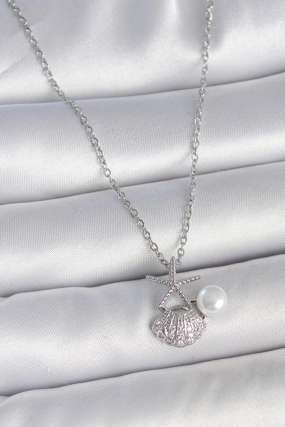 316L Çelik Gümüş Renk Zincir Zirkon Taşlı Deniz Kabuğu Model İnci Detay Kadın Kolye - TJ-BKO10044