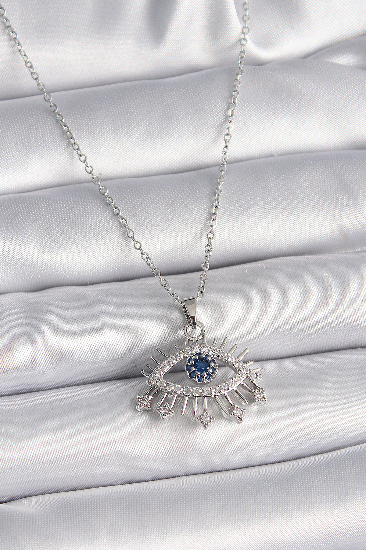 316L Çelik Gümüş Renk Zincir Zirkon Taşlı Göz Model Kadın Kolye - TJ-BKO9564