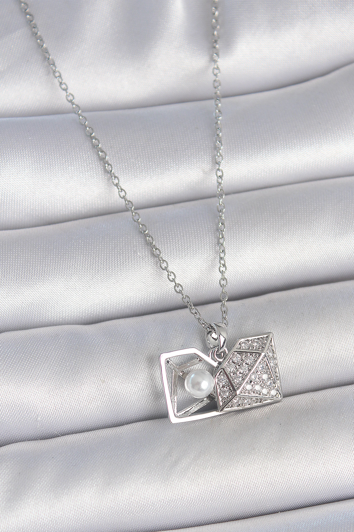 316L Çelik Gümüş Renk Zincir Zirkon Taşlı İncili Açılır Elmas Model Kadın Kolye - TJ-BKO10048