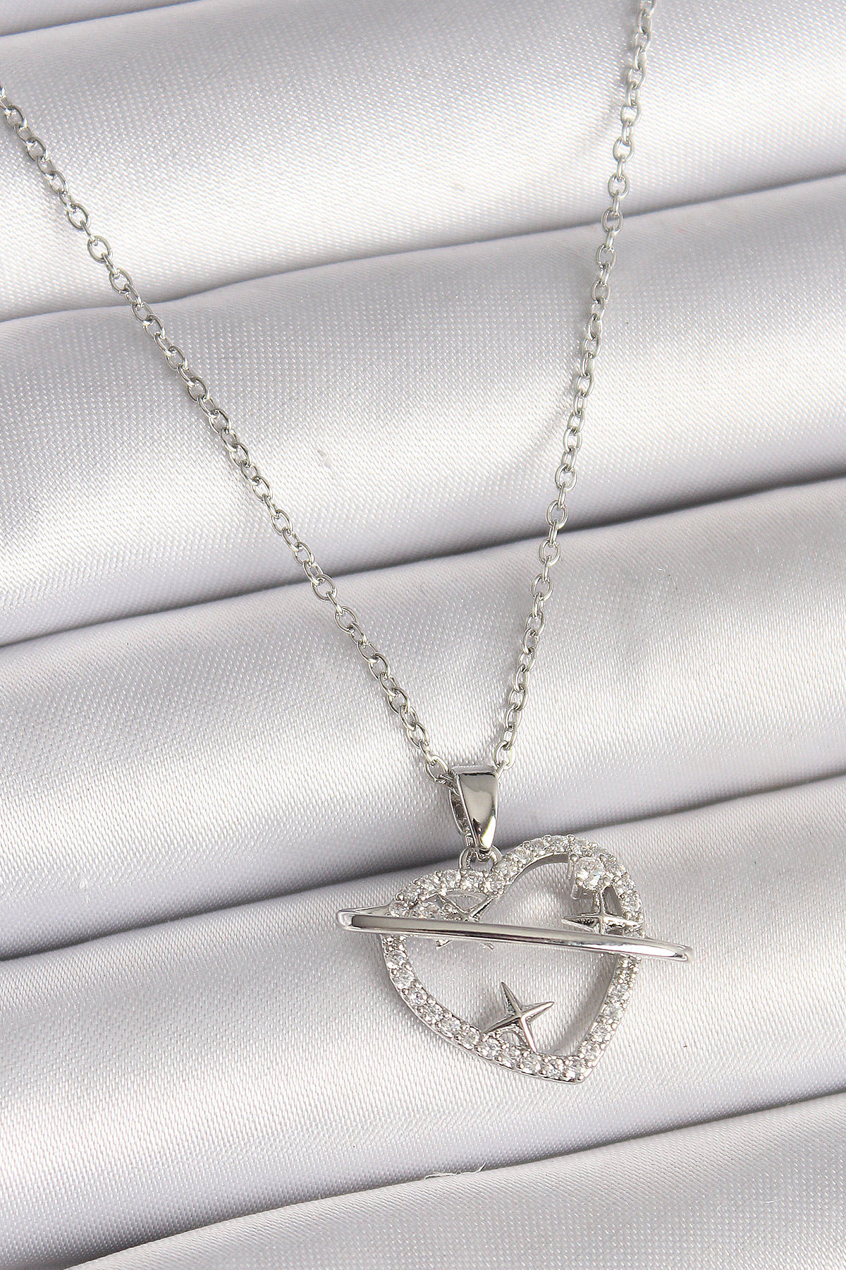 316L Çelik Gümüş Renk Zincir Zirkon Taşlı Kalp Model Yıldız Detay Kadın Kolye - TJ-BKO9860
