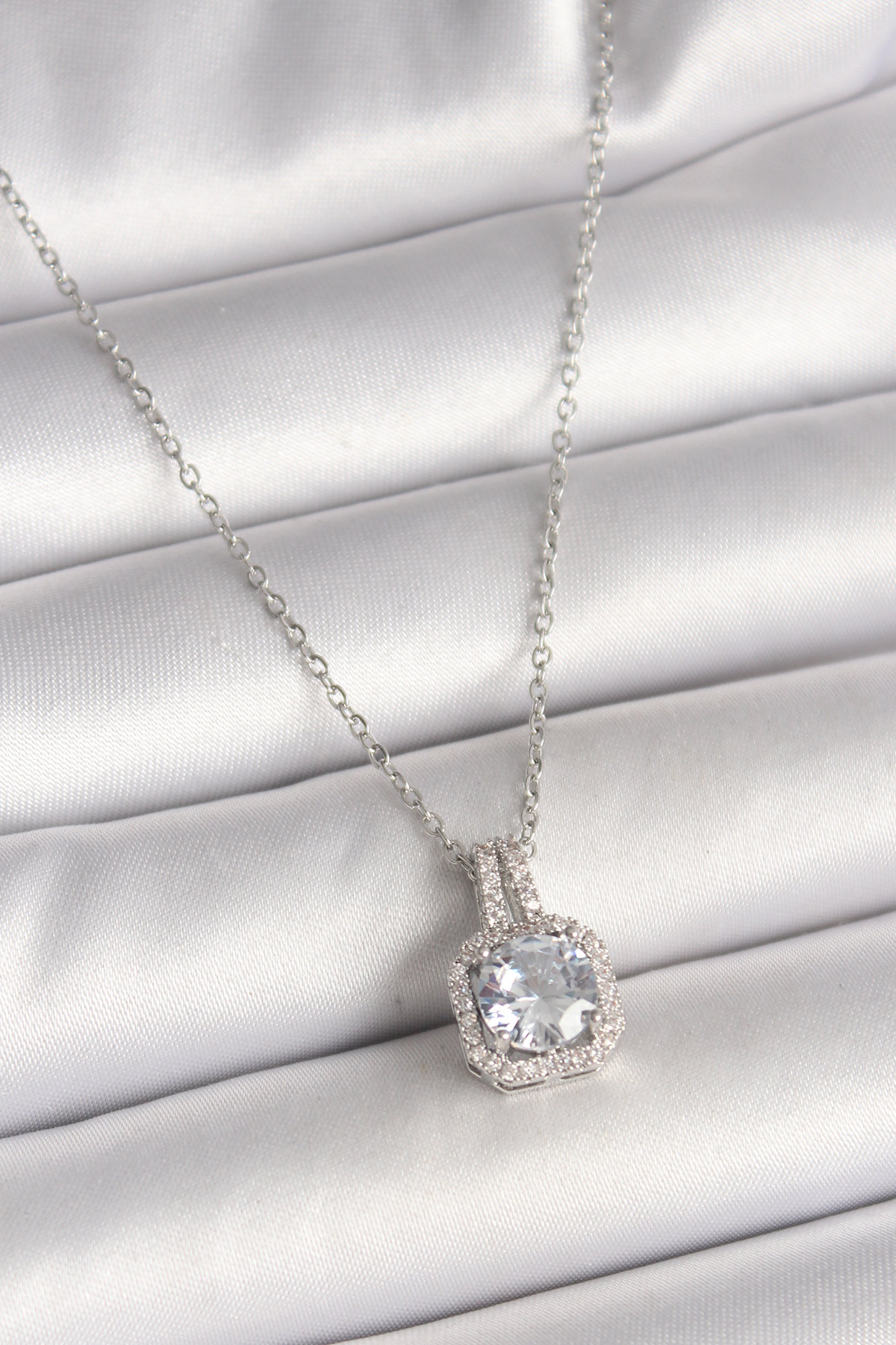 316L Çelik Gümüş Renk Zincir Zirkon Taşlı Kare Model Kadın Kolye - TJ-BKO9957