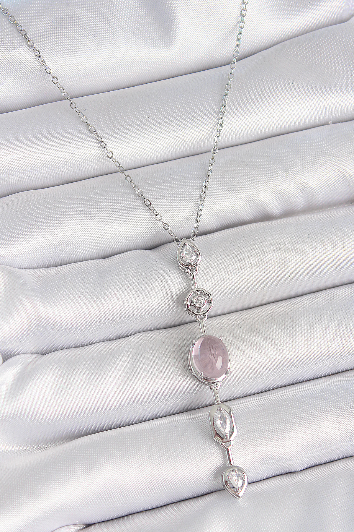 316L Çelik Gümüş Renk Zincir Zirkon Taşlı Pembe Sedefli Y Model Dekolte Kadın Kolye - TJ-BKO10209