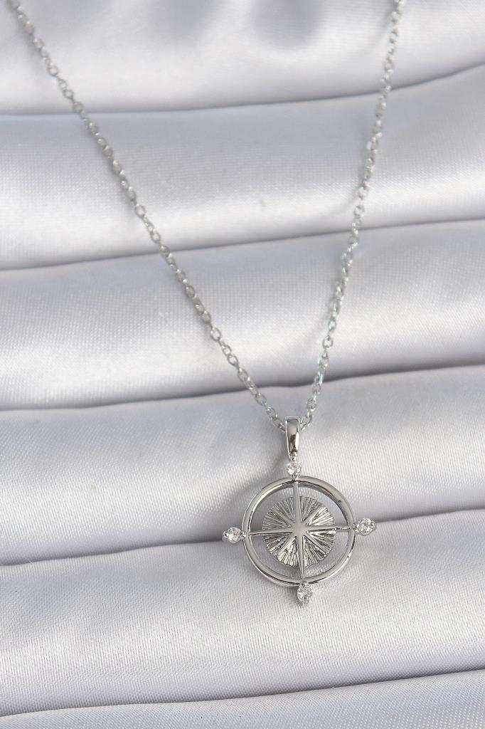 316L Çelik Gümüş Renk Zincir Zirkon Taşlı Pusula Model Kadın Kolye - BKO10038