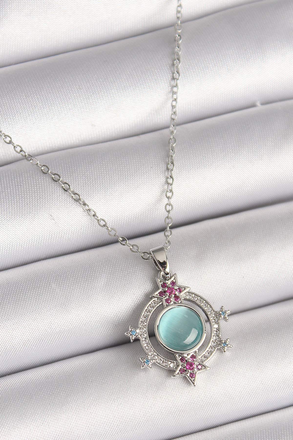 316L Çelik Gümüş Renk Zincir Zirkon Taşlı Yıldız Detay Yeşil Sedefli Kadın Kolye - TJ-BKO9867