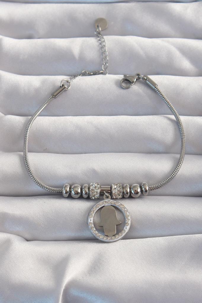 316L Çelik Gümüş Renk Zirkon Taş Aksesuarlı Fatma Ana Eli Bileklik - TJ-BB6234