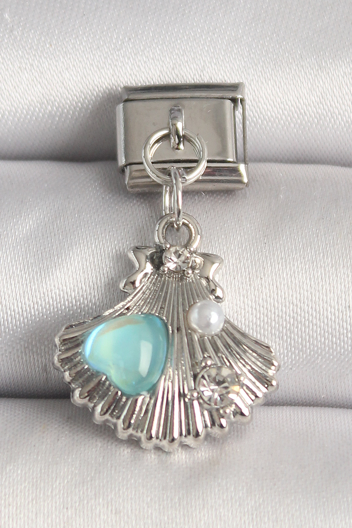 316L Çelik Gümüş Renk Zirkon Taşlı Deniz Kabuğu Model Mavi Mineli Kalp Detay Nomination Charm - TJ-BC1260