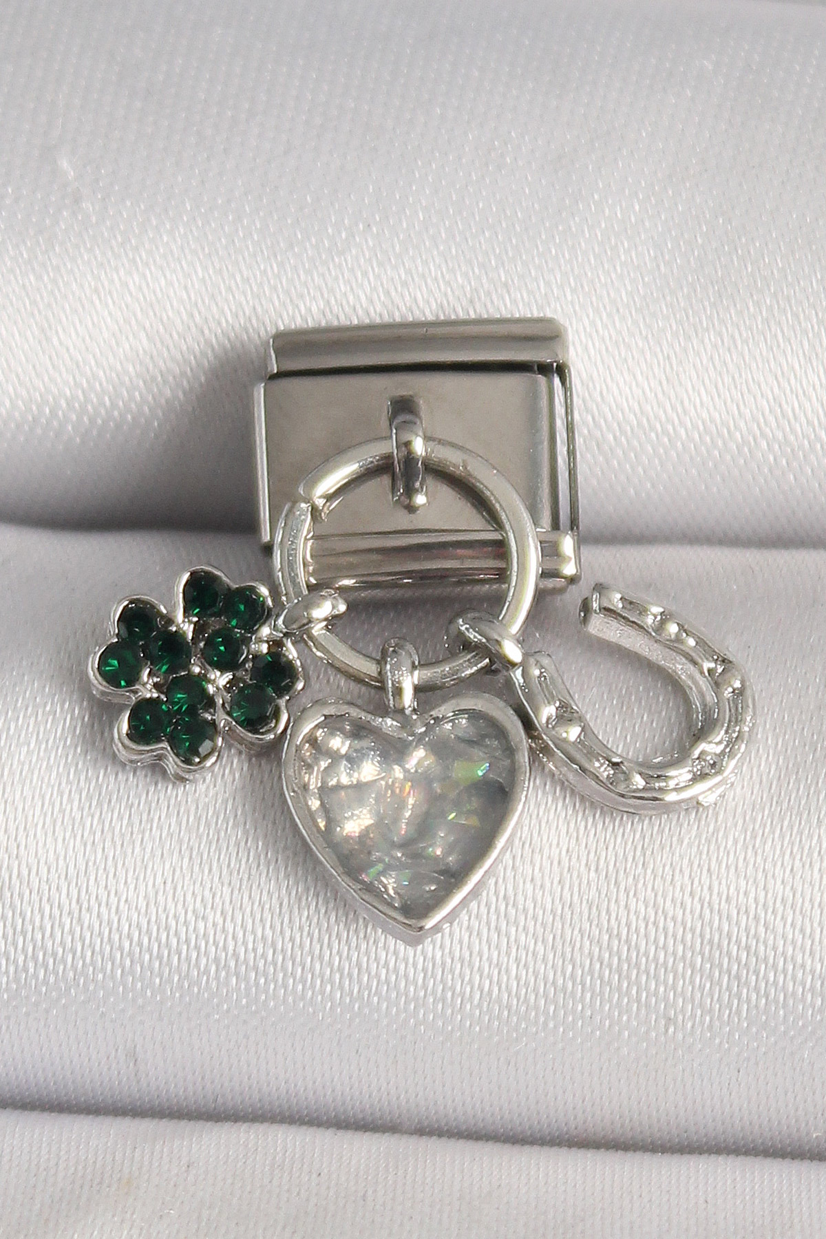 316L Çelik Gümüş Renk Zirkon Taşlı Kalp Yonca Nal Model Nomination Charm - TJ-BC1314