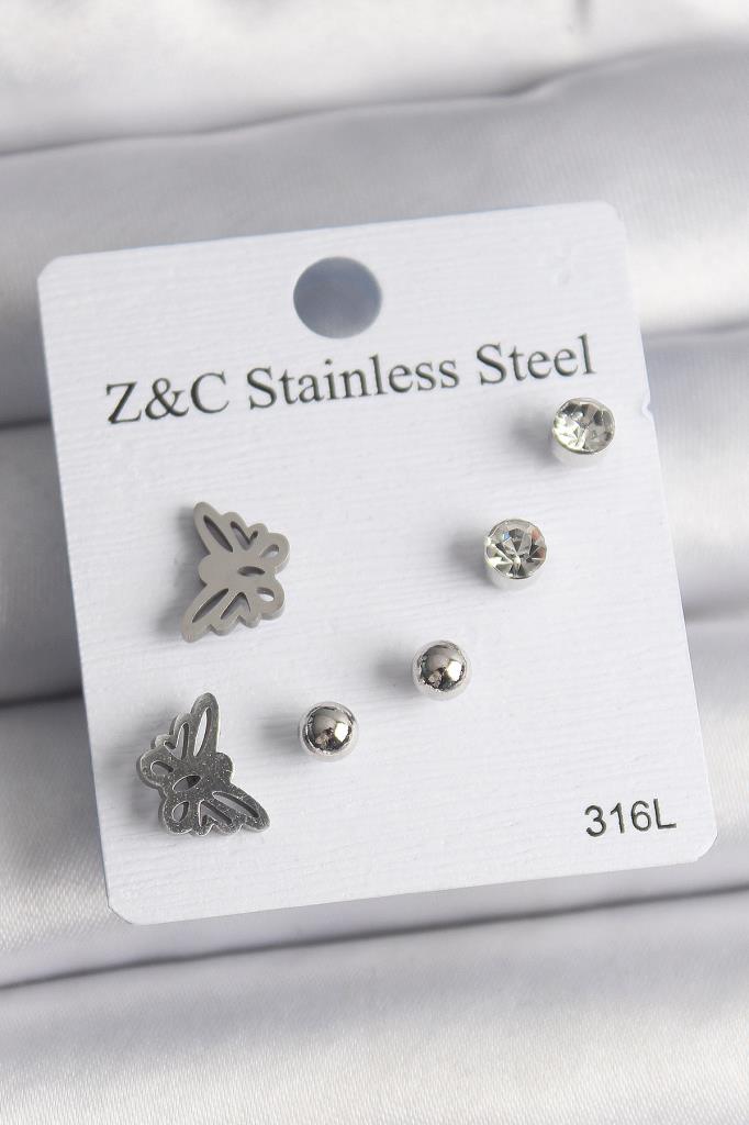 316L Çelik Gümüş Renk Zirkon Taşlı Kelebek Model Kadın Küpe Seti - TJ-BKP10008