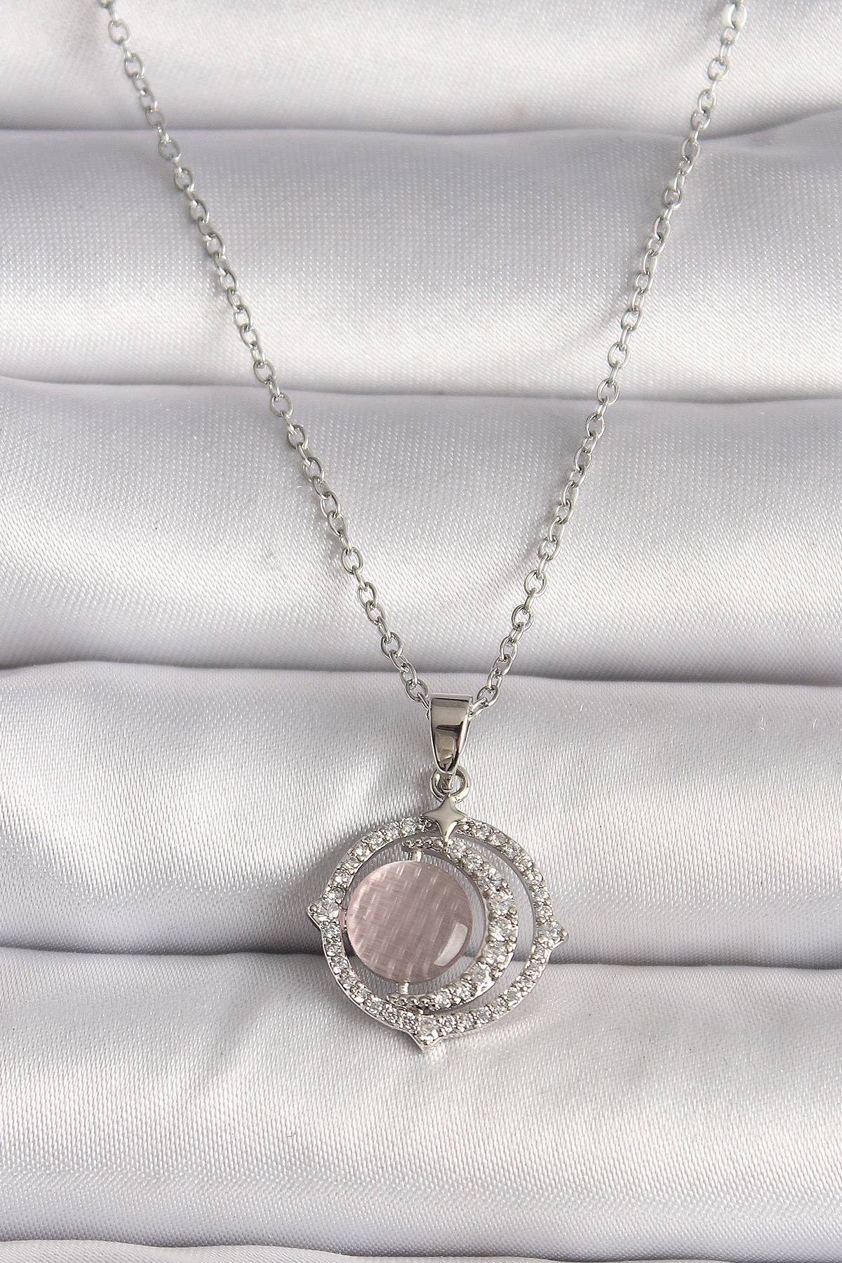 316L Çelik Gümüş Renk Zirkon Taşlı Pembe Sedefli Hilal Model Kadın Kolye - TJ-BKO9701