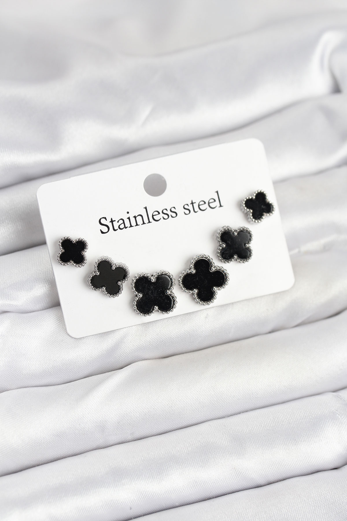 316L Çelik Gümüş Siyah Renk 3 Boy Yonca Küpe Seti - TJ-BKP11234