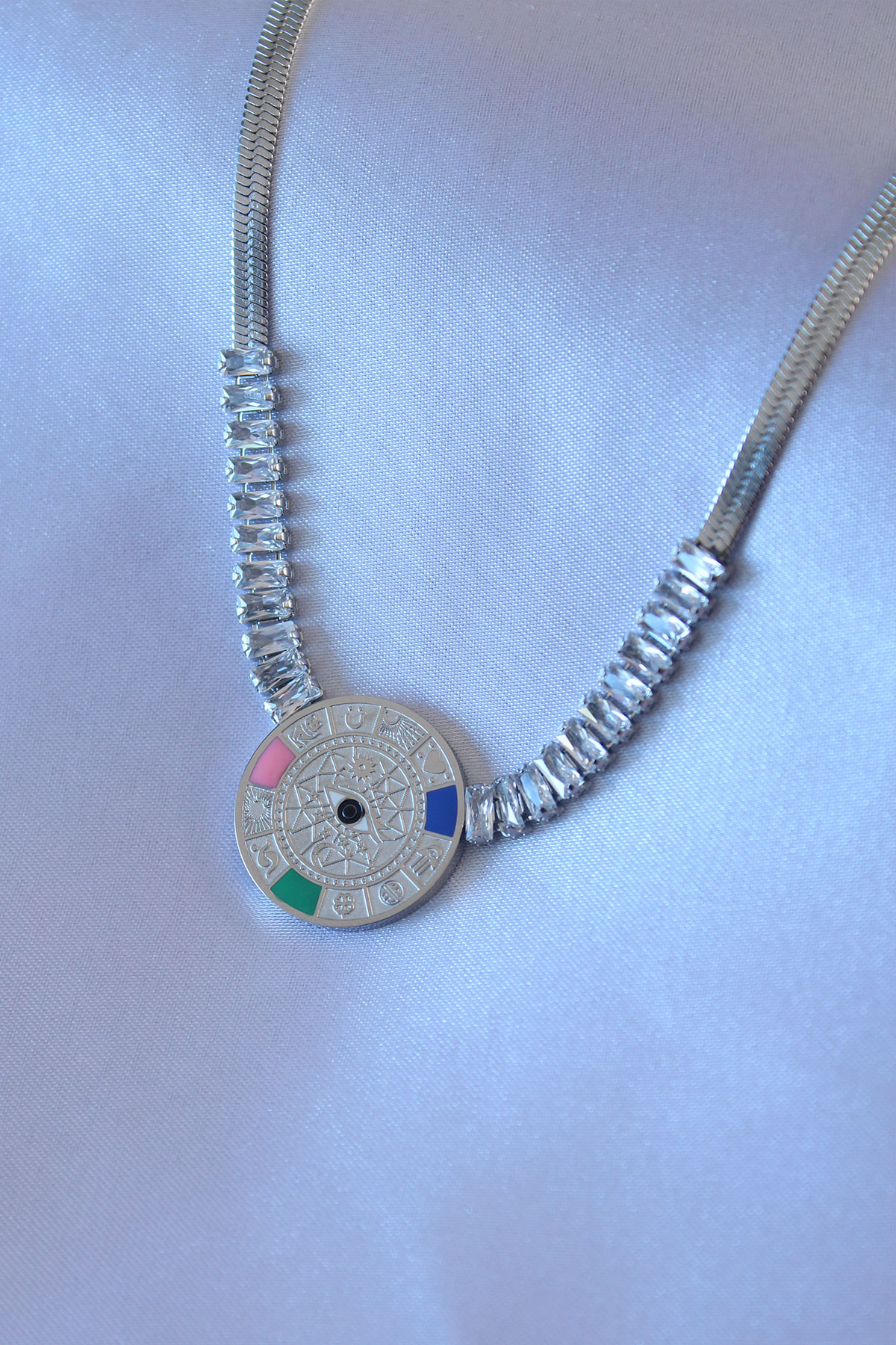 316L Çelik Gümüş Zirkon Taşlı İtalyan Zincir Burç İşeleme Madalyon Kadın Kolye - TJ-BKO7520