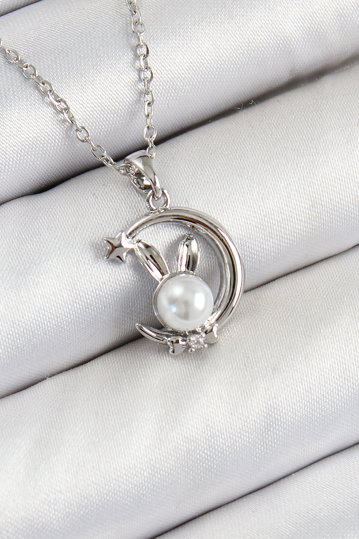 316L Çelik İnci Detaylı Hilal Tavşan Model Gümüş Renk Kadın Kolye - TJ-BKO10348