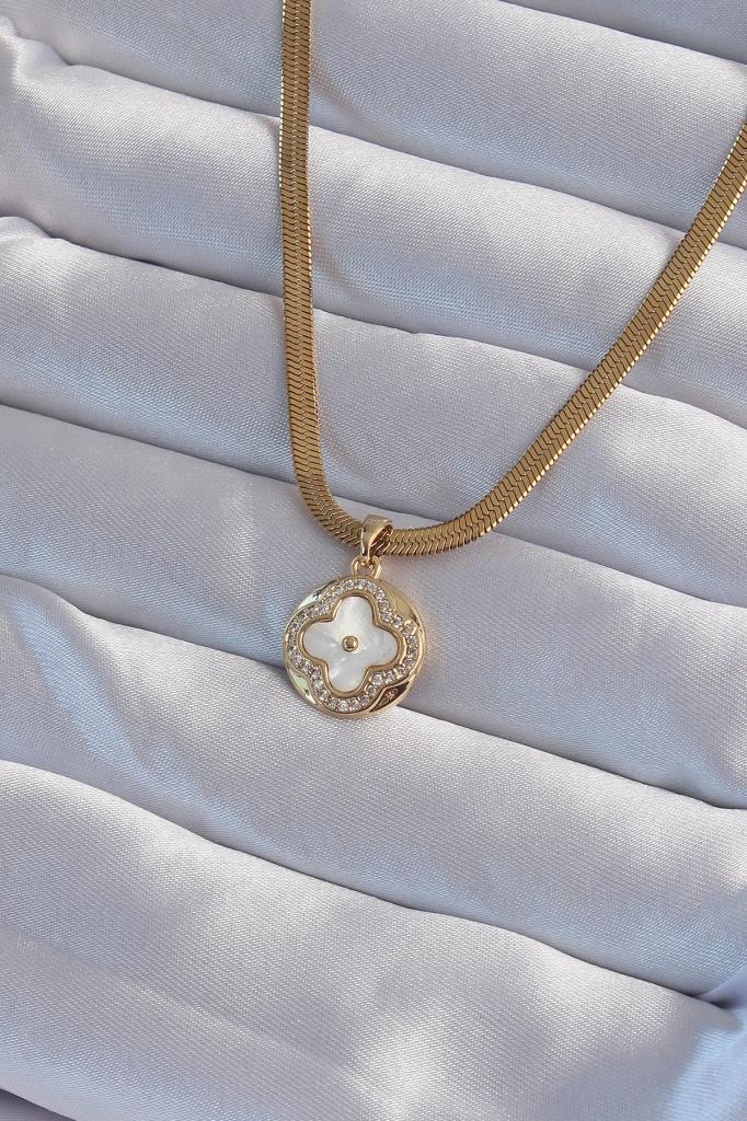 316L Çelik İtalyan Zincirli Gold Renk Zirkon Taşlı Sedefli Yonca Model Kolye - TJ-BKO8987