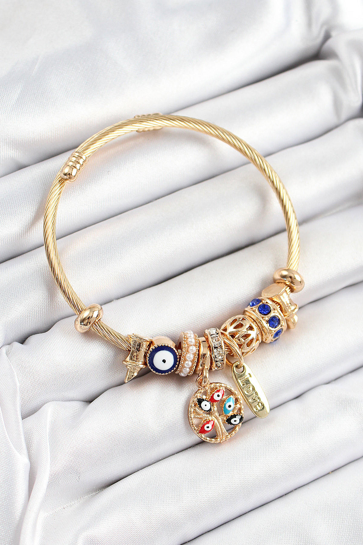 316L Çelik Lacivert Nazarlı Zirkon Taşlı İnci Detaylı Hayat Ağacı Model Gold Renk Charm Bileklik - TJ-BB7315
