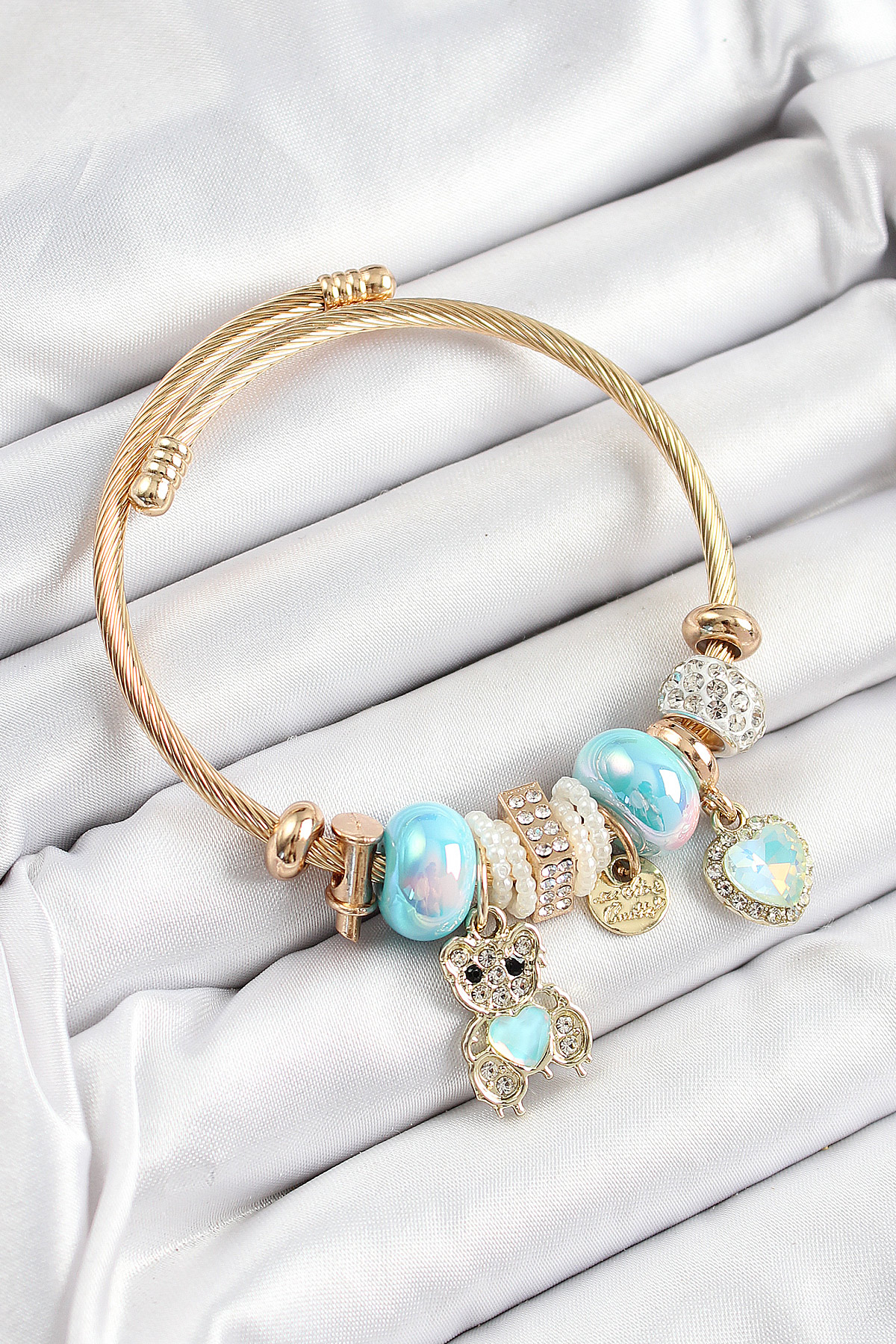 316L Çelik Mavi Zirkon Taşlı Ayıcık Ve Kalp Model Gold Renk Charm Bileklik - TJ-BB7303