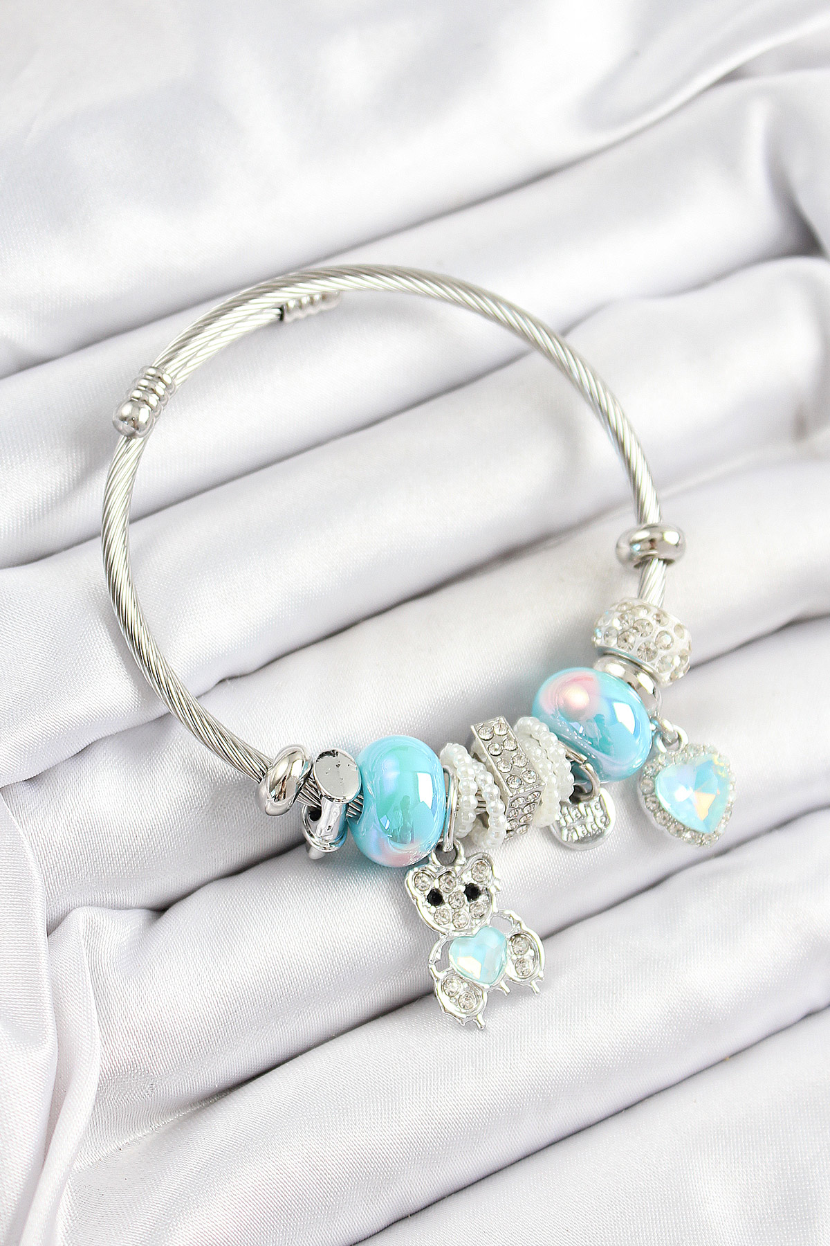 316L Çelik Mavi Zirkon Taşlı Ayıcık Ve Kalp Model Gümüş Renk Charm Bileklik - TJ-BB7253