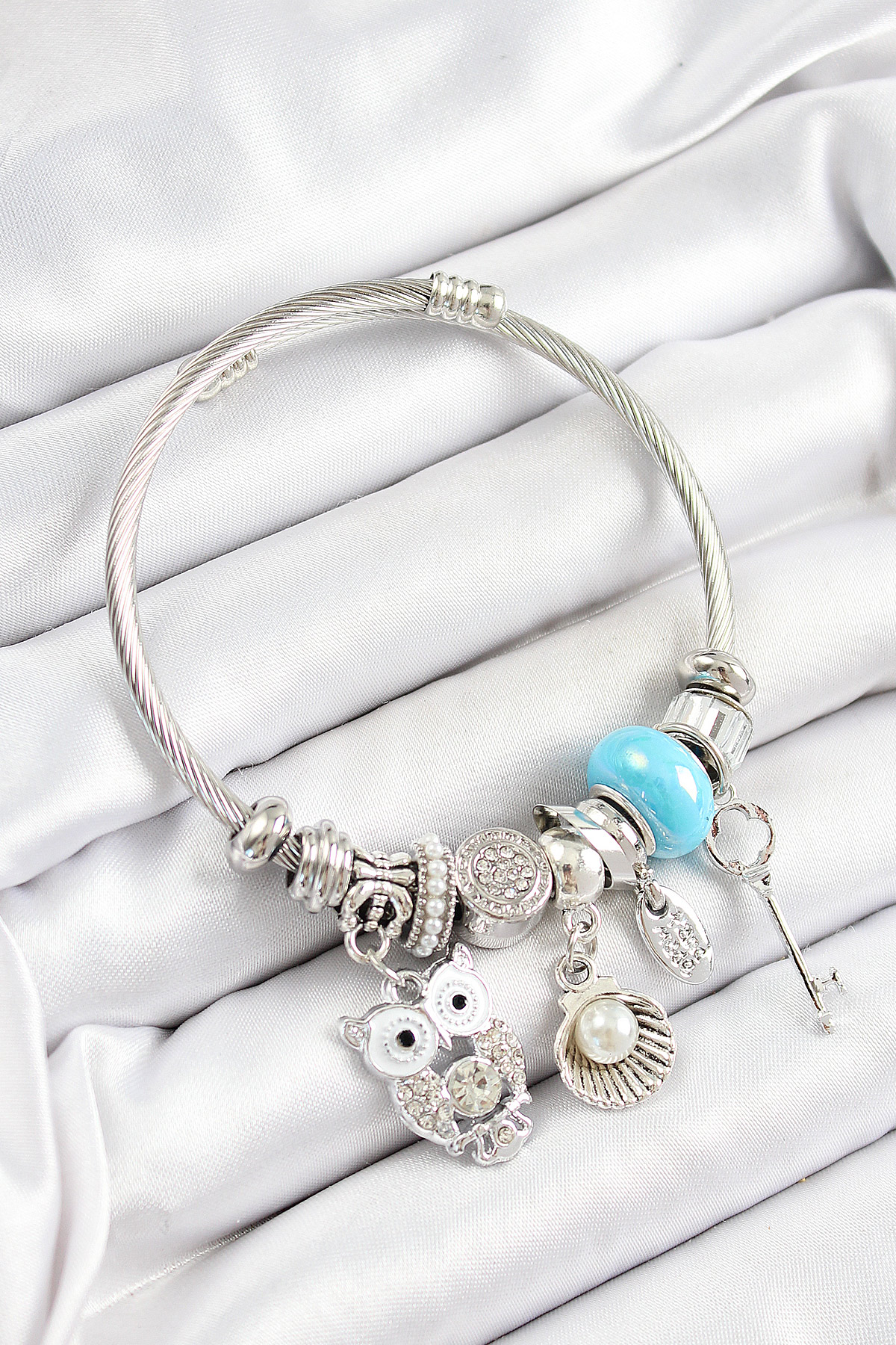 316L Çelik Mavi Zirkon Taşlı Baykuş İstiridye Ve Anahtar Model Gümüş Renk Charm Bileklik - TJ-BB7256