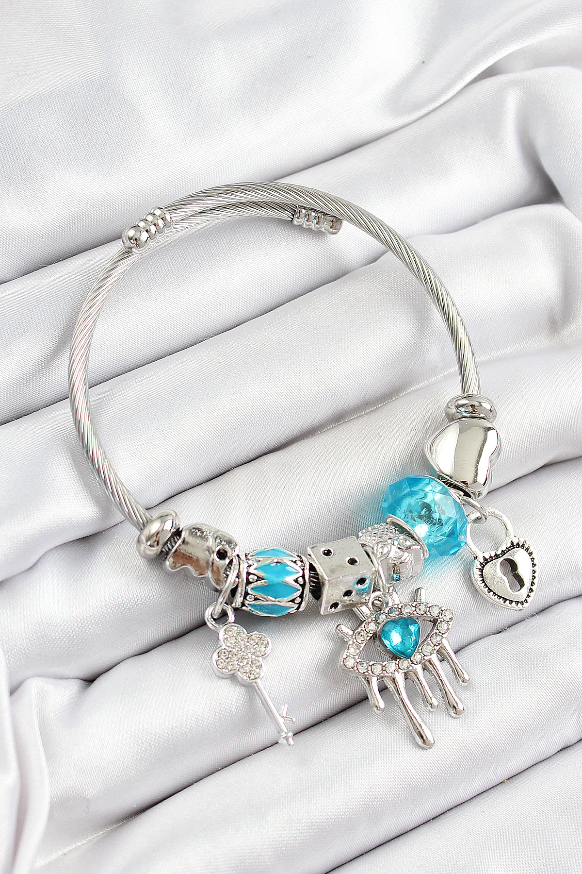 316L Çelik Mavi Zirkon Taşlı Göz Kilit Ve Anahtar Model Gümüş Renk Charm Bileklik - TJ-BB7262