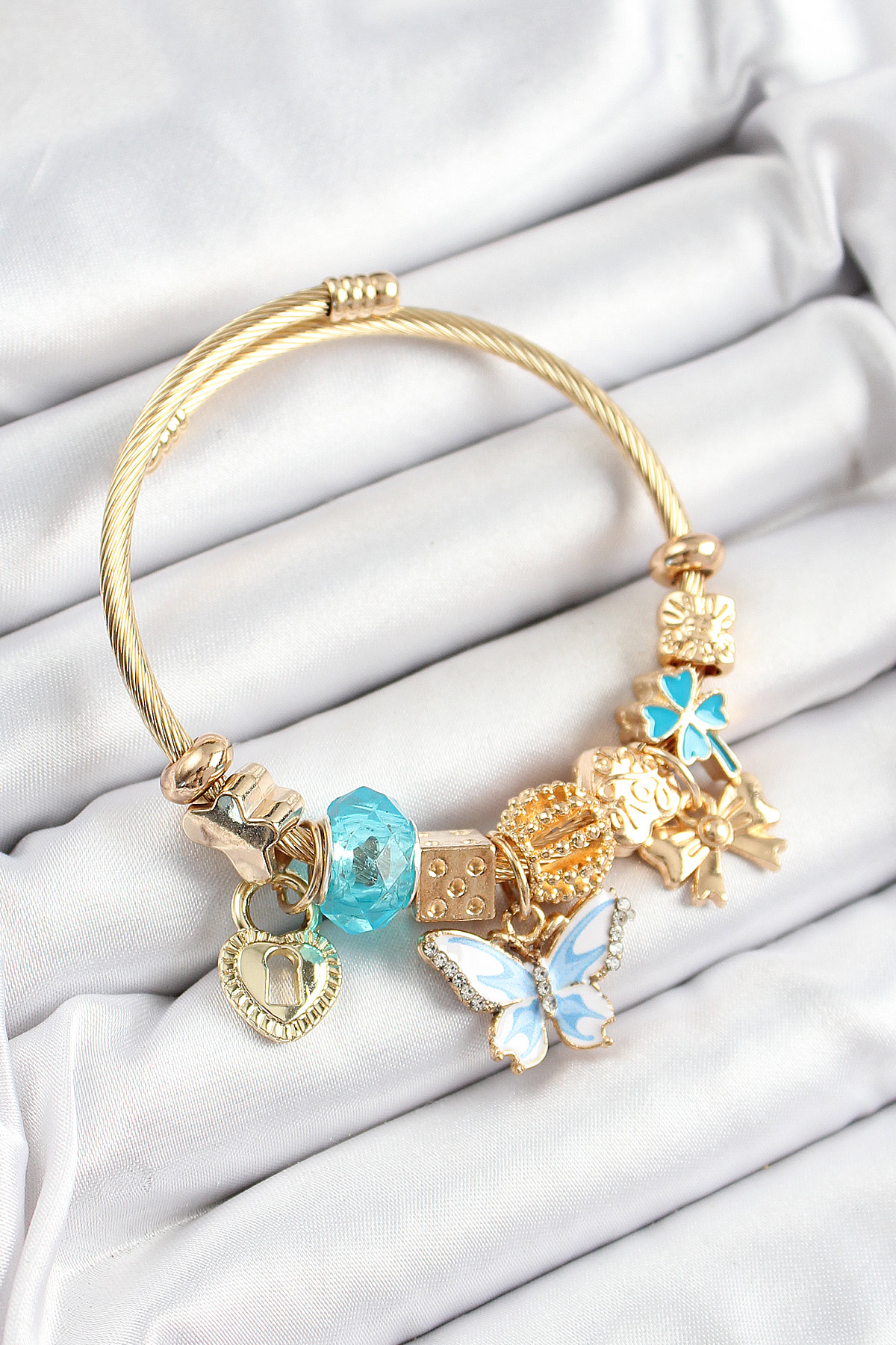 316L Çelik Mavi Zirkon Taşlı Kelebek Fiyonk Ve Kilit Model Gold Renk Charm Bileklik - TJ-BB7312