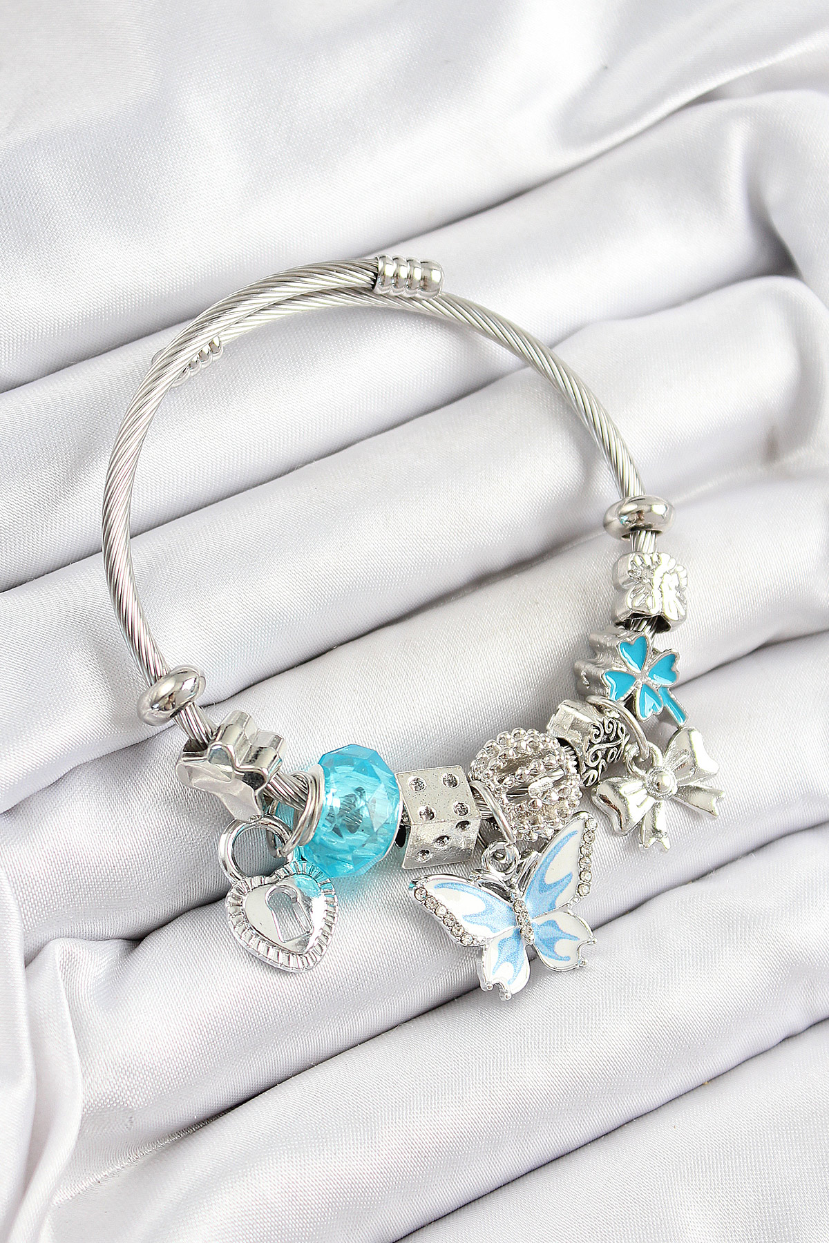 316L Çelik Mavi Zirkon Taşlı Kelebek Fiyonk Ve Kilit Model Gümüş Renk Charm Bileklik - TJ-BB7247