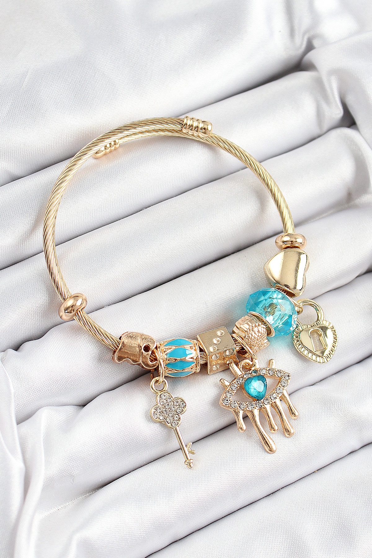 316L Çelik Mavi Zirkon Taşlı Kilit Göz Ve Anahtar Model Gold Renk Charm Bileklik - TJ-BB7300