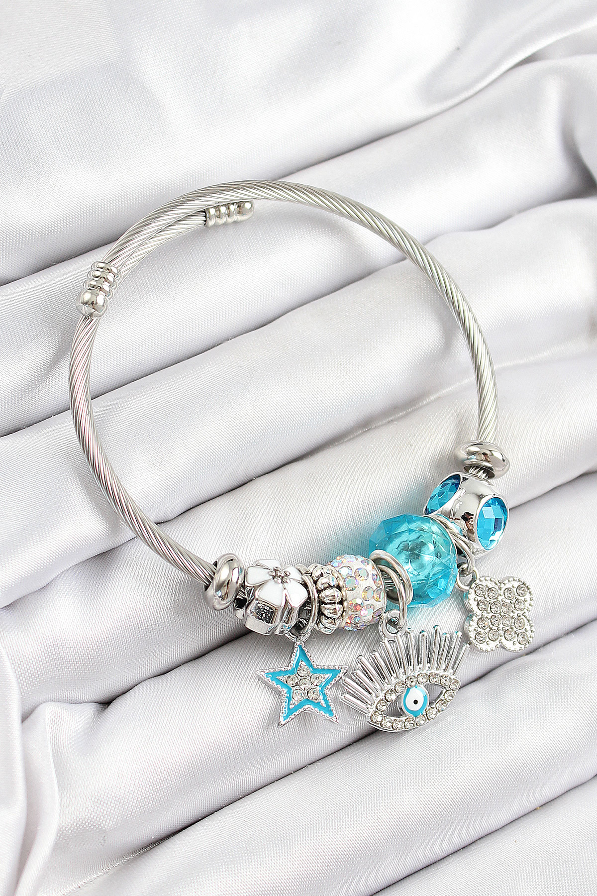 316L Çelik Mavi Zirkon Taşlı Yıldız Göz Ve Yonca Model Gümüş Renk Charm Bileklik - TJ-BB7274