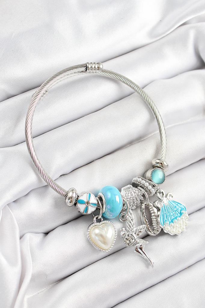 316L Çelik Mavi Zirkon Taşlı Yıldız Melek İstiridye Ve Kalp Model Gümüş Renk Charm Bileklik - BB7281