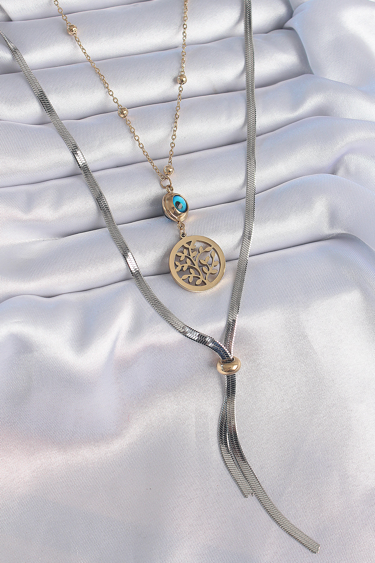 316L Çelik Mix Renk Filiz Figür Nazar Boncuk Detay Uzun Kadın Kolye - TJ-BKO9400