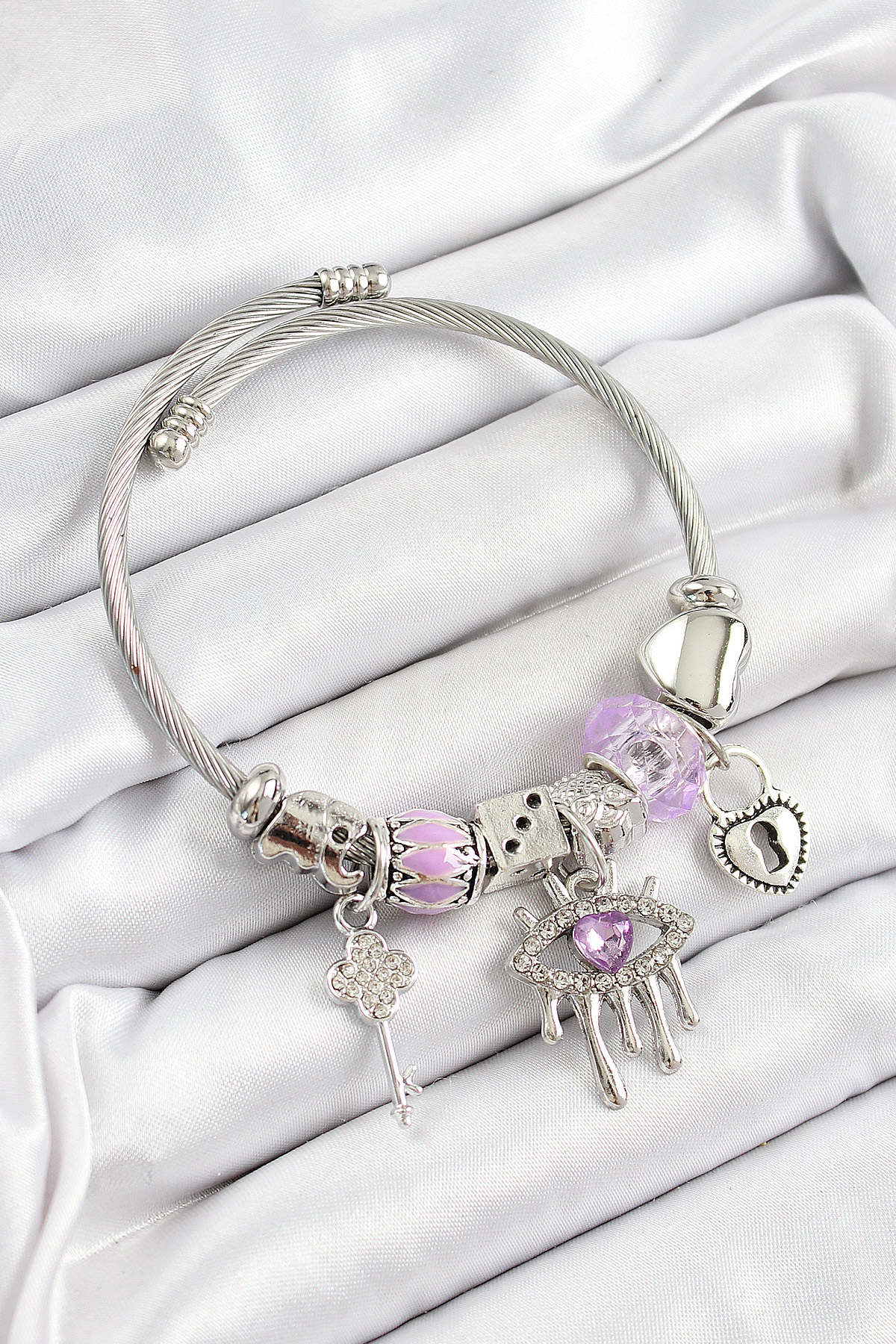 316L Çelik Mor Zirkon Taşlı Göz Kilit Ve Anahtar Model Gümüş Renk Charm Bileklik - TJ-BB7260