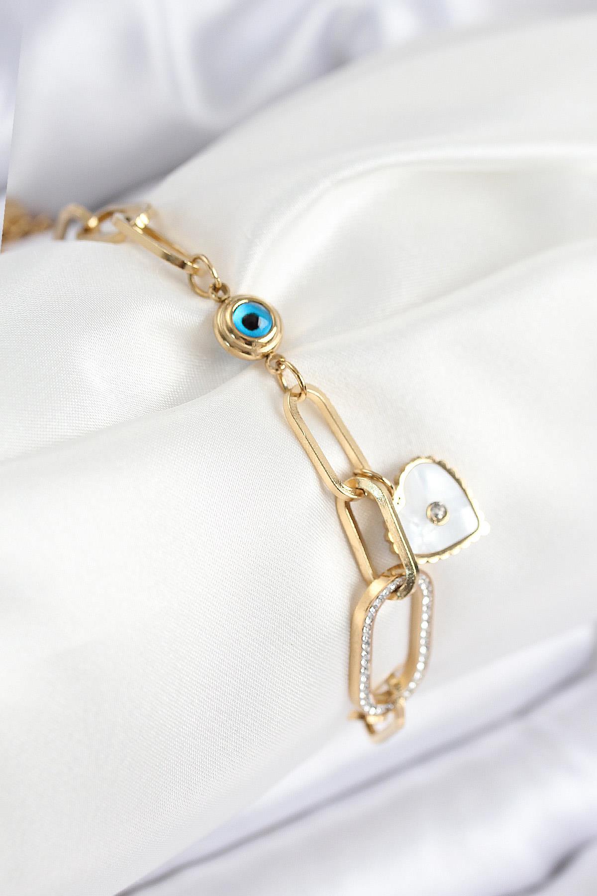 316L Çelik Nazar Boncuğu Ve Zirkon Taşlı Kalp Model Gold Renk Kadın Bileklik - TJ-BB7837