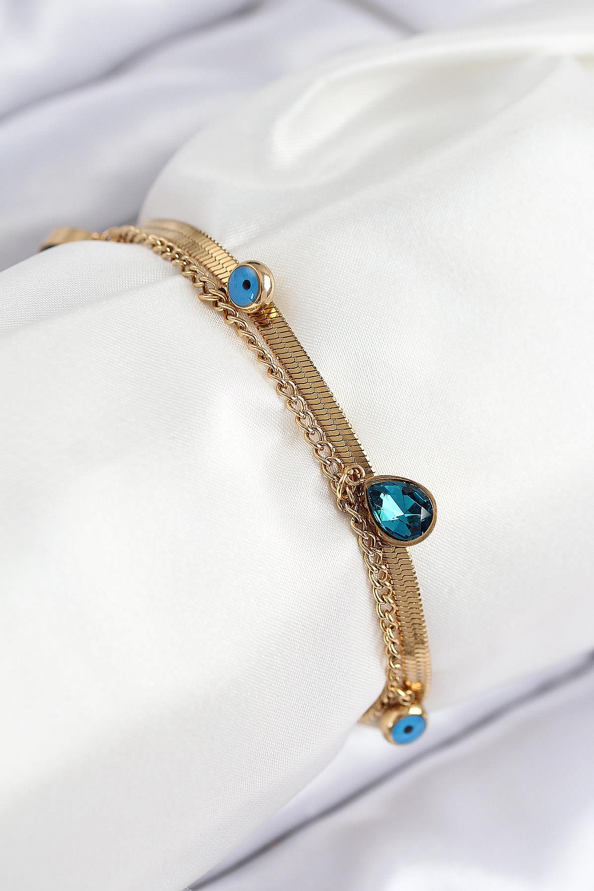 316L Çelik Nazar Boncuk Detaylı Mavi Zirkon Taşlı Model İtalyan Zincir Gold Renk Kadın Bileklik - TJ-BB7828