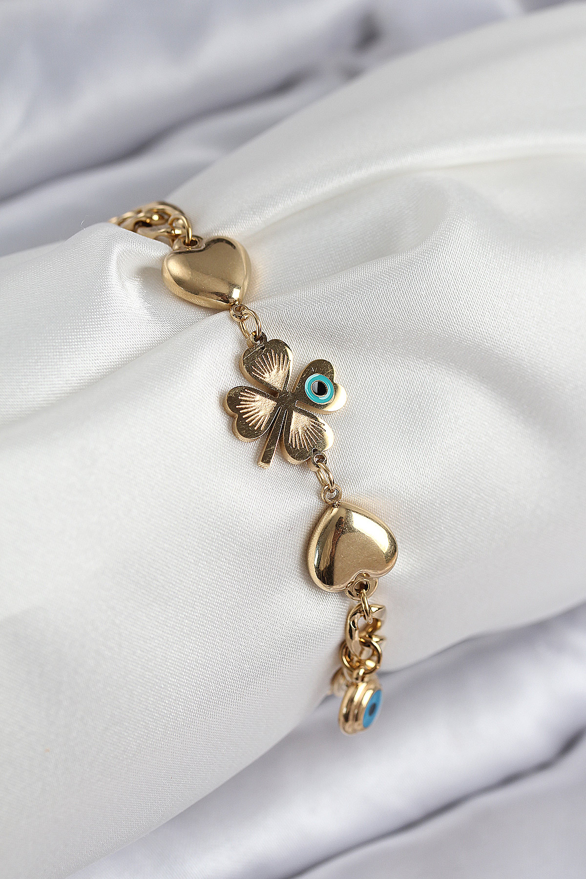 316L Çelik Nazar Boncuk Detaylı Yonca Model Gold Renk Kadın Bileklik - TJ-BB7832